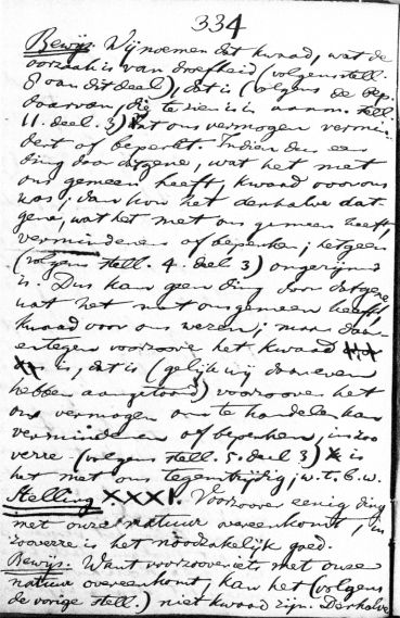 Bewijs. Wij noemen dat kwaad, wat de oorzaak is van droefheid (volgens stell. 8 van dit deel), dat is (volgens de bep. daarvan, die te zien is in aanm. stell. 11 deel 3) dat ons vermogen vermindert of beperkt. Indien dus een ding door datgene, wat het met ons gemeen heeft, kwaad voor ons was; dan kon het derhalve datgene, wat het met ons gemeen heeft, verminderen of beperken; hetgeen (volgens stell. 4 deel 3) ongerijmd is. Dus kan geen ding door datgene wat het met ons gemeen heeft, kwaad voor ons wezen; maar daarentegen voorzoover het kwaad is, dat is (gelijk wij daareven hebben aangetoond) voorzoover het ons vermogen om te handelen kan verminderen of beperken, in zooverre (volgens stell. 5 deel 3) is het met ons tegenstrijdig; w.t.b.w. Stelling XXXI. Voorzoover eenig ding met onze natuur overeenkomt in zooverre is het noodzakelijk goed. Bewijs. Want voorzoover iets met onze natuur overeenkomt, kan het (volgens de vorige stell.) niet kwaad zijn. Derhalve >> aantal woorden: 164 |
