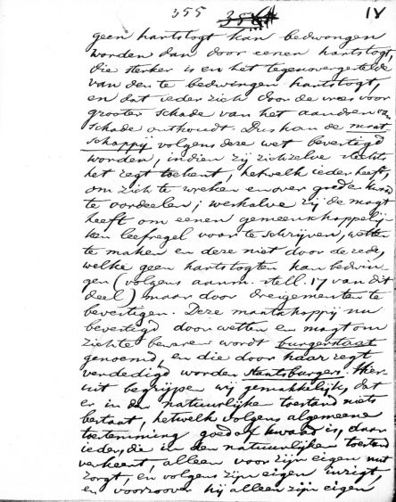 geen hartstogt kan bedwongen worden dan door eenen hartstogt, die sterker is en het tegenovergestelde van den te bedwingen hartstogt, en dat ieder zich door de vrees voor grooter schade van het aandoen van schade onthoudt. Dus kan de maatschappij volgens deze wet bevestigd worden, indien zij zichzelve slechts het regt toekent, hetwelk ieder heeft, om zich te wreken en over goed en kwaad te oordelen; weshalve zij de magt heeft om eenen gemeenschappelijken leefregel voor te schrijven, wetten te maken en deze niet door de rede, welke geen hartstogten kan bedwingen (volgens aanm. stell. 17 van dit deel) maar door dreigementen te bevestigen. Deze maatschappij nu bevestigd door wetten en magt om zich te bewaren wordt burgerstaat genoemd, en die door haar regt verdedigd worden staatburgers. Hieruit begrijpen wij gemakkelijk, dat er in den natuurlijke toestand niets bestaat, hetwelk volgens algemeene toestemming goed of kwaad is, daar ieder, die in den natuurlijken toestand verkeert, alleen voor zijn eigen nut zorgt, en volgens zijn eigen inzigt, en voorzoover hij alleen zijn eigen >> aantal woorden: 174 |