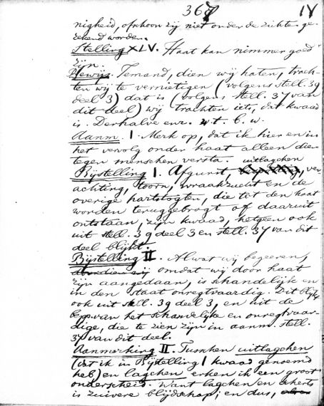 nigheid, ofschoon zij niet onder de ziektes gerekend worden. Stelling XLV. Haat kan nimmer goed zijn. Bewijs. Iemand, dien wij haten, trachten wij te vernietigen (volgens stell. 39 deel 3) dat is (volgens stell. 37 van dit deel) wij trachten iets, dat kwaad is. Derhalve enz. w.t.b.w. Aanm. I. Merk op, dat ik hier en in het vervolg onder haat alleen dien tegen menschen versta. Bijstelling I. Afgunst, uitlagchen, verachting, toorn, wraakzucht en de overige hartstogten, die tot den haat worden teruggebragt of daaruit ontstaan, zijn kwaad, hetgeen ook uit stell. 39 deel 3 en stell. 37 van dit deel blijkt. Bijstelling II. Alwat wij begeeren, omdat wij door haat zijn aangedaan, is schandelijk en in den staat onregtvaardig. Dit blijkt ook uit stell. 39 deel 3, en uit de bep. van het schandelijke en onregtvaardige, die te zien zijn in aanm. stell. 37 van dit deel. Aanmerking II. Tusschen uitlagchen (dat ik in Bijstelling 1 kwaad genoemd heb) en lagchen erken ik een groot onderscheid. Want lagchen en scherts is zuivere blijdschap; en dus, >> aantal woorden: 176 |