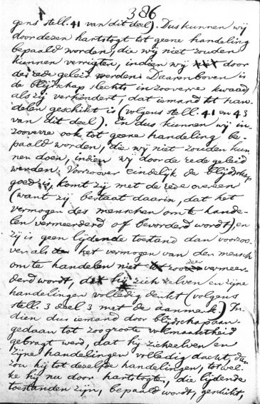 gens stell. 41 van dit deel). Dus kunnen wij door dezen hartstogt tot geene handeling bepaald worden, die wij niet zouden kunnen verrigten, indien wij door de rede geleid werden. Daarenboven is de blijdschap slechts inzooverre kwaad als zij verhindert, dat iemand tot handelen geschikt is (volgens stell. 41 en 43 van dit deel). En dus kunnen wij in zooverre ook tot geene handeling bepaald worden, die wij niet zouden kunnen doen, indien wij door de rede geleid werden. Voorzoover eindelijk de blijdschap goed is, komt zij met de rede overeen (want zij bestaat daarin, dat het vermogen des menschen om te handelen vermeerderd of bevorderd wordt), en zij is geen lijdende toestand dan voorzoover als het vermogen van den mensch om te handelen niet zoozeer vermeerderd wordt, dat hij zich zelven en zijne handelingen volledig denkt (volgens stell. 3 deel 3 met de aanmerk.) Indien dus iemand door blijdschap aangedaan tot zoo groote volmaaktheid gebragt werd, dat hij zichzelven en zijne handelingen volledig dacht, dan zou hij tot dezelfde handelingen, tot welke hij nu door hartstogten, die lijdende toestanden zijn, bepaald wordt, geschikt, >> aantal woorden: 185 |