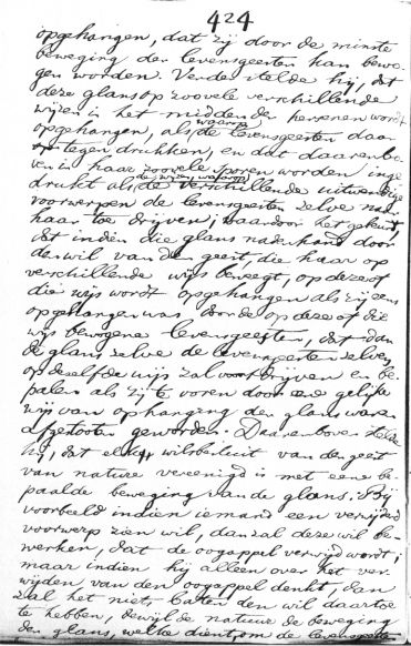 opgehangen, dat zij door de minste beweging der levensgeesten kan bewogen worden. Verder stelde hij, dat deze glans op zoovele verschillende wijzen in het midden der hersenen wordt opgehangen, als waarop de levensgeesten daar tegen drukken, en dat daarenboven in haar zoovele sporen worden ingedrukt als de wijzen, waarop de verschillende uitwendige voorwerpen de levensgeesten zelve naar haar toe drijven; waardoor het gebeurt, dat indien die glans naderhand door den wil van den geest, die haar op verschillende wijs beweegt, op deze of die wijs wordt opgehangen als zij eens opgehangen was door de op deze of die wijs bewogene levensgeesten, dat dan de glans zelve de levensgeesten zelven op dezelfde wijs zal voortdrijven en bepalen als zij te voren door eene gelijke wijs van ophanging der glans waren afgestooten geworden. Daarenboven stelde hij, dat elk wilsbesluit van den geest van nature vereenigd is met eene bepaalde beweging van de glans. Bij voorbeeld indien iemand een verwijderd voorwerp zien wil, dan zal deze wil bewerken, dat de oogappel verwijd wordt; maar indien hij alleen over het verwijden van den oogappel denkt, dan zal het niets baten den wil daartoe te hebben, dewijl de natuur de beweging der glans, welke dient, om de levensgeesten >> aantal woorden: 204 |