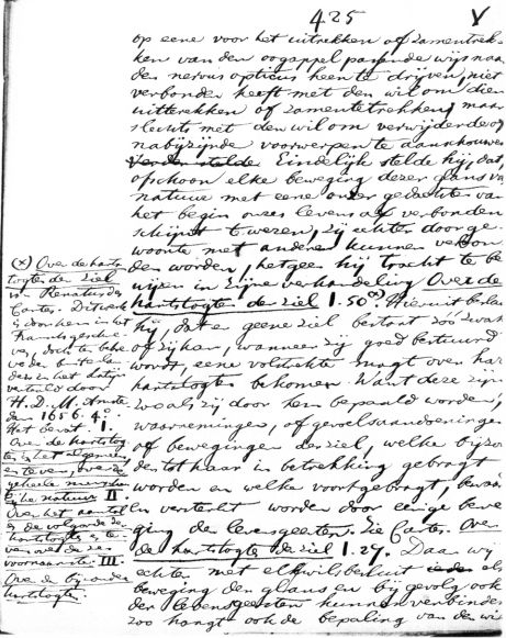op eene voor het uitrekken of zamentrekken van den oogappel passende wijs naar den nervus opticus heen te drijven, niet verbonden heeft met den wil om dien uitterekken of zamentetrekken; maar slechts met den wil om verwijderde of nabijzijnde voorwerpen te aanschouwen. Eindelijk stelde hij, dat, ofschoon elke beweging dezer glans van natuur met eene onzer gedachten van het begin onzes levens af verbonden schijnt te wezen, zij echter door gewoonte met andere kunnen verbonden worden, hetgeen hij tracht te bewijzen in zijne verhandeling Over de hartstogten der ziel I. 50.(*) Hieruit besloot hij, dat er geene ziel bestaat zóó zwak of zij kan, wanneer zij goed bestuurd wordt, eene volstrekte magt over hare hartstogten bekomen. Want deze zijn zooals zij door hem bepaald worden; waarnemingen, of gevoelsaandoeningen of bewegingen der ziel, welke bijzonder tot haar in betrekking gebragt worden en welke voortgebragt, bewaard en versterkt worden door eenige beweging der levensgeesten. Zie Cartes. Over de hartstogten der ziel I. 27. Daar wij echter met elk wilsbesluit elke beweging der glans en bijgevolg ook der levensgeesten kunnen verbinden, zoo hangt ook de bepaling van den wil >> (*) Over de hartstogten der ziel van Renatus des Cartes. Dit werk is door hem in het Fransch geschreven, doch ten behoeve der buitenlanders in het Latijn vertaald door H. D. M. Amsterdam 1656 4°. Het bevat. I. Over de hartstogten in het algemeen, en tevens, over de geheele menschelijke natuur II. Over het aantal en de volgorde der hartstogten en tevens over de zes voornaamste. III. Over de bijzondere hartstogten. aantal woorden: 260 |