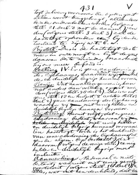 togt zelven, voorzoover die op den geest alleen wordt teruggebragt, alleen door de rede onderscheiden worden (volgens stell. 21. deel. 2 met de aanm.); en dus (volgens stell. 3 deel 3) zal de hartstogt ophouden een lijdende toestand te zijn; w.t.b.w. Bijstell. Dus is de hartstogt des te meer in onze magt en lijdt de geest daarvan des te minder, naarmate hij ons meer bekend is. Stelling IV. Er is geene aandoening des ligchaams, waarvan wij niet eenig helder en duidelijk begrip kunnen vormen. Bewijs. Wat aan alleen gemeen is, kan niet anders dan volledig opgevat worden volgens stell. 38 deel 2). Dus is er (volgens stell. 12 en hulpst. 2 achter stell. 13 deel 2) geene aandoening des ligchaams, waarvan wij niet eenig helder en duidelijk begrip kunnen vormen. Bijstelling. Hieruit volgt, dat er geene aandoening bestaat, waarvan wij niet eenig helder en duidelijk begrip kunnen vormen. Een hartstogt toch is het denkbeeld van eene aandoening des ligchaams (volgens de algem. bep. des hartst.), dat daarom (volgens de vorige stell.) eenig helder en duidelijk begrip moet insluiten. Aanmerking. Nademaal er niets bestaat, waaruit niet eenig gevolg voortvloeit (volgens stell. 36 deel 1), en wij alles, wat uit een denkbeeld, dat in >> aantal woorden: 203 |