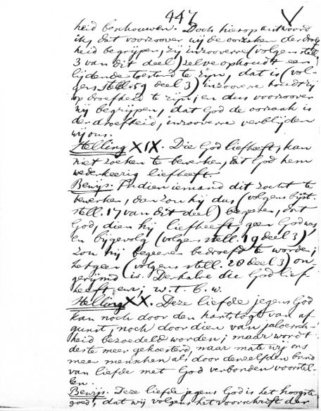 heid beschouwen. Doch hierop antwoord ik, dat voorzoover wij de oorzaken der droefheid begrijpen, zij inzooverre (volgens stell. 3 van dit deel) zelve ophoudt een lijdende toestand te zijn, dat is (volgens stell. 59 deel 3) inzooverre houdt zij op droefheid te zijn; en dus voorzoover wij begrijpen, dat God de oorzaak is der droefheid, inzooverre verblijden wij ons. Stelling XIX. Die God liefheeft, kan niet zoeken te bewerken, dat God hem wederkeerig liefheeft. Bewijs. Indien iemand dit zocht te bewerken, dan zou hij dus (volgens bijst. stell. 17 van dit deel) begeeren, dat God, dien hij liefheeft, geen God was, en bijgevolg (volgens stell. 19 deel 3) zou hij begeeren bedroefd te worden; hetgeen (volgens stell. 28 deel 3) ongerijmd is. Derhalve die God liefheeft enz; w.t.b.w. Stelling XX. Deze liefde jegens God kan noch door den hartstogt van afgunst, noch door dien van jaloerschheid bezoedeld worden; maar wordt des te meer gekoesterd, naar mate wij ons meer menschen als door denzelfden band van liefde met God verbonden voorstellen. Bewijs. Deze liefde jegens God is het hoogste goed, dat wij volgens het voorschrift der >> aantal woorden: 186 |