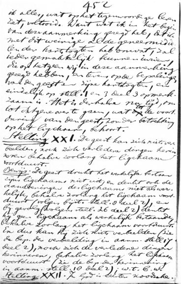 ik alles, wat op het tegenwoordige leven ziet, voltooid. Want wat ik in het begin van deze aanmerking gezegd heb, dat ik met dit weinige al de geneesmiddelen der hartstogten heb omvat, zal ieder gemakkelijk kunnen inzien, die op hetgeen wij in deze aanmerking gezegd hebben, en tevens op de bepalingen van den geest en zijne hartstogten, en eindelijk op stell. 1 en 3 deel 3 opmerkzaam is. Het is derhalve nu tijd, om tot datgene over te gaan, wat tot de voortduring van den geest, zonder betrekking op het ligchaam, behoort. Stelling XXI. De geest kan zich niets verbeelden, noch zich verleden dingen herinneren behalve zoolang het ligchaam voortduurt. Bewijs. De geest drukt het werkelijke bestaan zijns ligchaams niet uit, en denkt ook de aandoeningen des ligchaams niet als werkelijk, behalve zoolang het ligchaam voortduurt (volgens bijst. stell. 8 deel 2), en bij gevolg (volgens stell. 26 deel 2) denkt hij geen ligchaam als werkelijk bestaande, behalve zoolang het ligchaam voortduurt. En dus kan hij zich niets verbeelden (zie de bep. der verbeelding in aanm. stell. 17 deel 2), noch zich de verledene dingen herinneren, behalve zoolang het ligchaam voortduurt (zie de bep. der herinnering in aanm. stell. 18 deel 2); w.t.b.w. Stelling XXII. In God is echter noodzake- >> aantal woorden: 211 |