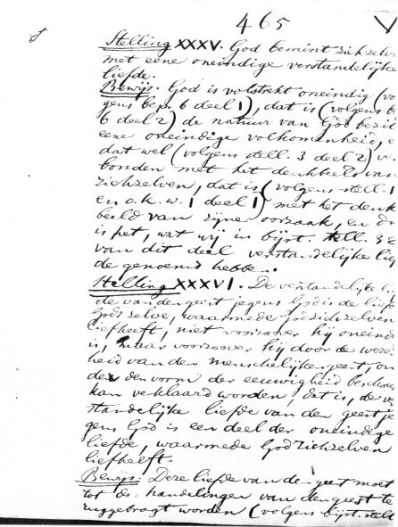 Stelling XXXV. God bemint zichzelven met eene oneindige verstandelijke liefde. Bewijs. God is volstrekt oneindig (volgens bep. 6 deel 1), dat is (volgens bep. 6 deel 2) de natuur van God bezit eene oneindige volkomenheid, en dat wel (volgens stell. 3 deel 2) verbonden met het denkbeeld van zichzelven, dat is (volgens stell. 1 en o.k.w. 1 deel 1) met het denkbeeld van zijne oorzaak, en dat is het, wat wij in bijst. stell. 32 van dit deel verstandelijke liefde genoemd hebben. Stelling XXXVI. De verstandelijke liefde van den geest jegens God is de liefde Gods zelve, waarmede God zichzelven liefheeft, niet voorzoover hij oneindig is, maar voorzoover hij door de wezenheid van den menschelijke geest, onder den vorm der eeuwigheid beschouwd kan verklaard worden, dat is, de verstandelijke liefde van den geest jegens God is een deel der oneindige liefde, waarmede God zichzelven liefheeft. Bewijs. Deze liefde van den geest moet tot de handelingen van den geest teruggebragt worden (volgens bijst. stell. >> aantal woorden: 164 |