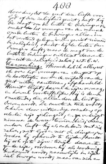 door dus, dat de geest deze liefde voor God of deze zaligheid geniet, heeft hij de magt om de lusten te bedwingen; en omdat het vermogen van den mensch om de lusten te bedwingen alleen in het verstand gelegen is. Dus geniet niemand de zaligheid, omdat hij de lusten bedwongen heeft, maar de magt om de lusten te bedwingen ontstaat daarentegen uit de zaligheid zelve; w.t.b.w. Aanmerking. Hiermede heb ik alles, wat ik over het vermogen van den geest op de hartstogten en over de vrijheid van den geest wilde aantoonen, afgehandeld. Hieruit blijkt, hoeveel de wijze vermag, en hoeveel voortreffelijker hij is dan de onwetende, die alleen door den lust gedreven wordt. De onwetende toch wordt, behalve door uitwendige oorzaken, op velerlei wijs geslingerd, en verkrijgt nimmer de ware tevredenheid; daarenboven leeft hij als onbekend met zich zelven, met God en met de dingen, en zoodra hij ophoudt te lijden, houdt hij ook op te zijn: terwijl daarentegen de wijze, voorzoover hij als zoodanig beschouwd wordt, naauwlijks in zijne ziel bewogen wordt; maar van zich en >> aantal woorden: 178 |