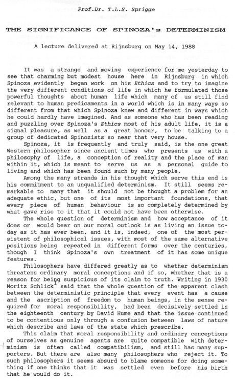 It was a strange and moving experience for me yesterday to see that charming but modest house here in Rijnsburg, in which Spinoza evidently began work on his Ethics and to try to imagine the very different conditions of life in which he formulated those powerful thoughts about human life which many of us still find relevant to human predicaments in a world which is in many ways so different from that which Spinoza knew and different in ways which he could hardly have imagined. And as someone who has been reading and puzzling over Spinoza's Ethics most of his adult life, it is a signal pleasure, as well as a great honour, to be talking to a group of dedicated Spinozists so near that very house.
